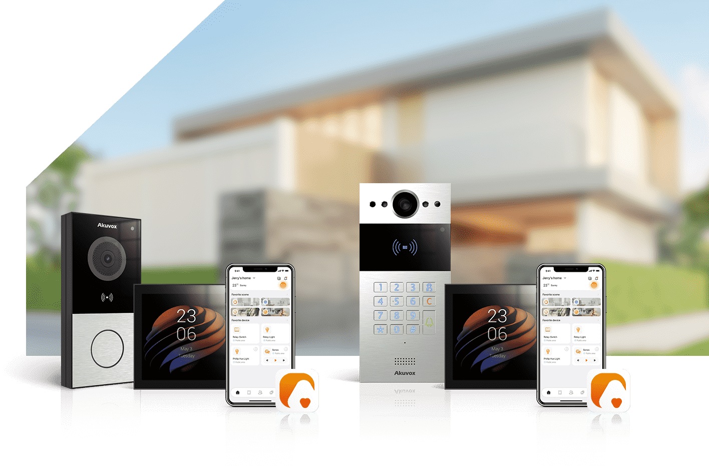 akubela smart home entry kit comprises a smart door phone, a smart home control panel, and a mobile application. Easy to configure, user-friendly, and with remote control available, it fits your intercom, access control, home automation, and home security needs in various scenarios.