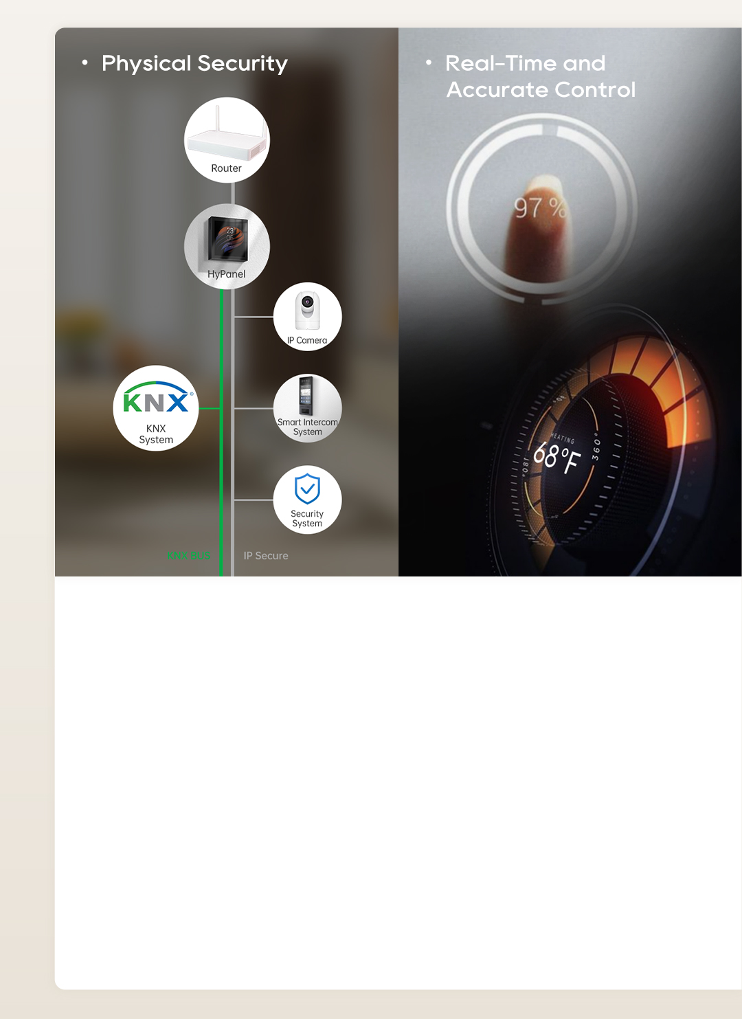 Thanks to the high interoperability of KNX solutions, akubela HyPanels can centrally manage and control various smart home sub-systems such as lighting, climate, access, security, HVAC, curtains, music, energy consumption and more.
